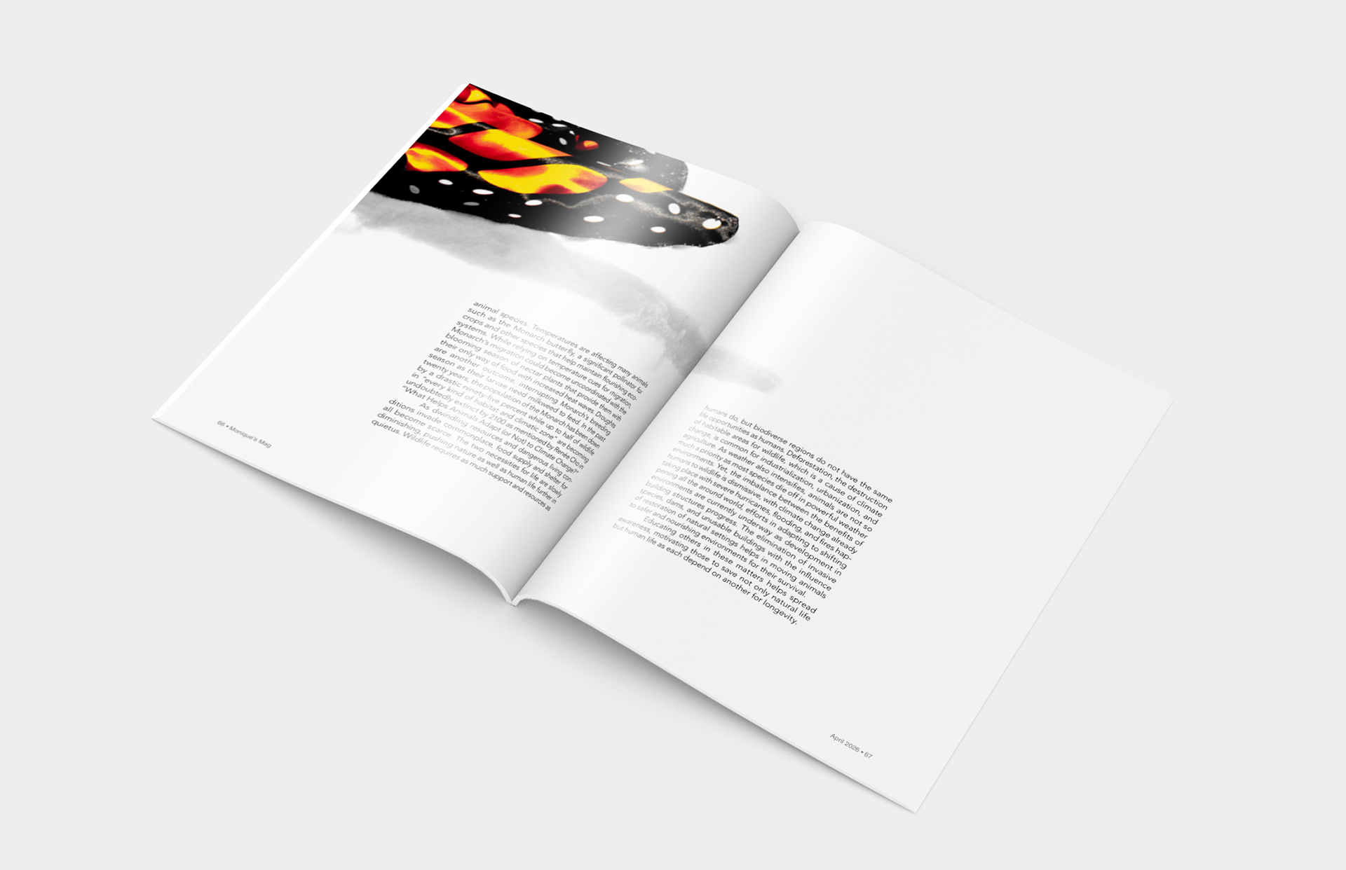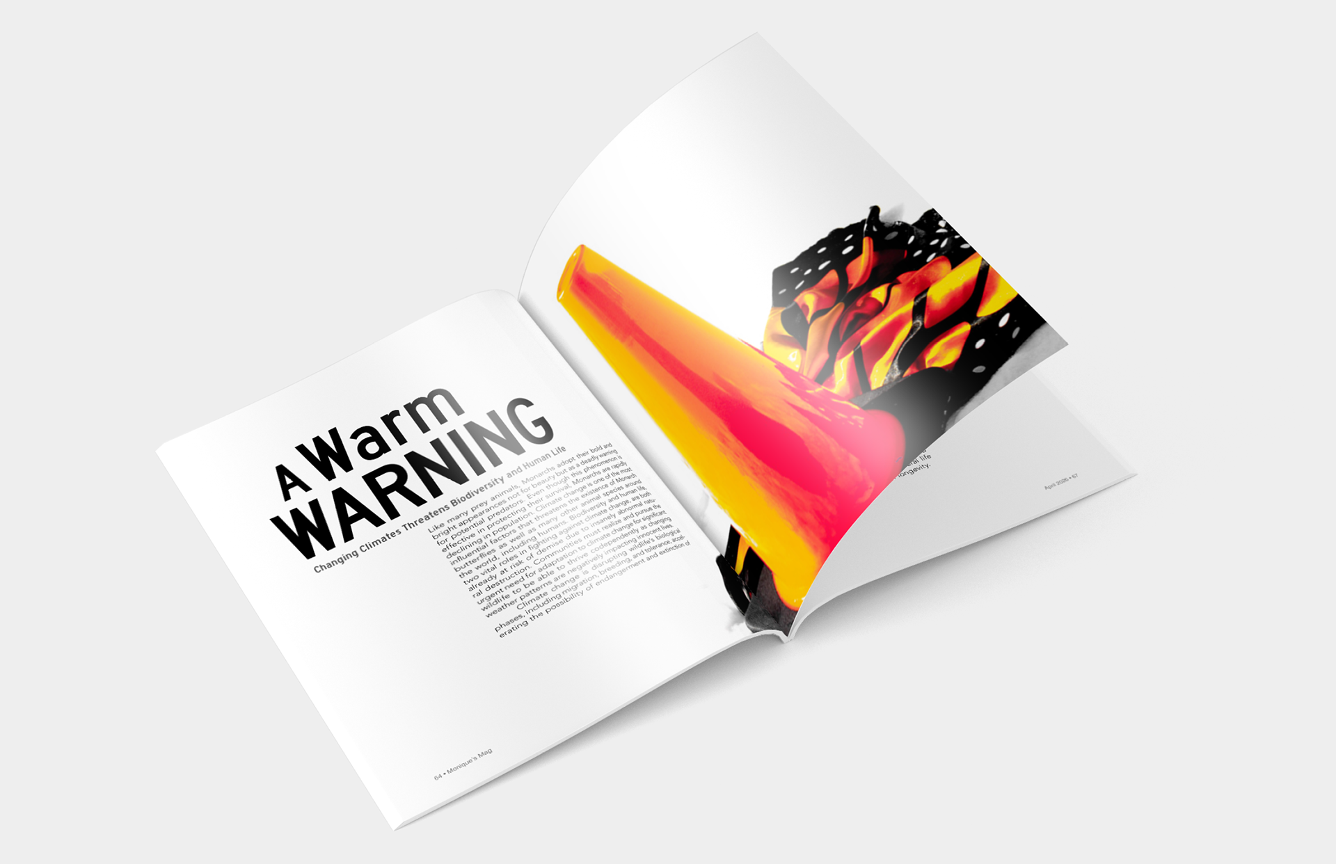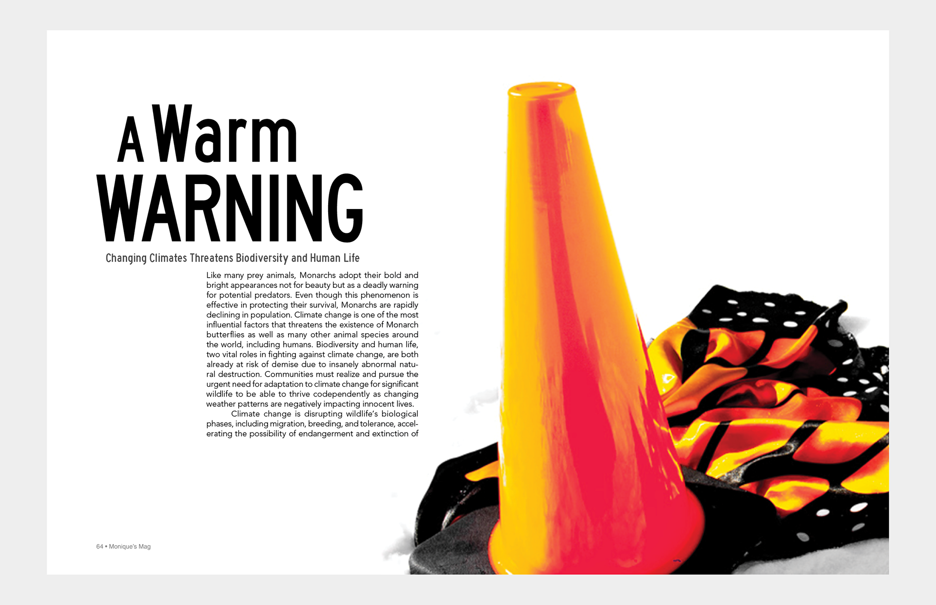 These magazine spreads highlight the impact of climate change using the Monarch Butterfly underneath a traffic cone as an example. The layout is organized, making the serious topic easier to read and understand. The spreads raises awareness effectively for young adults who are environmentally conscious. The visuals are clean, focused, and help communicate the message without overwhelming the reader.