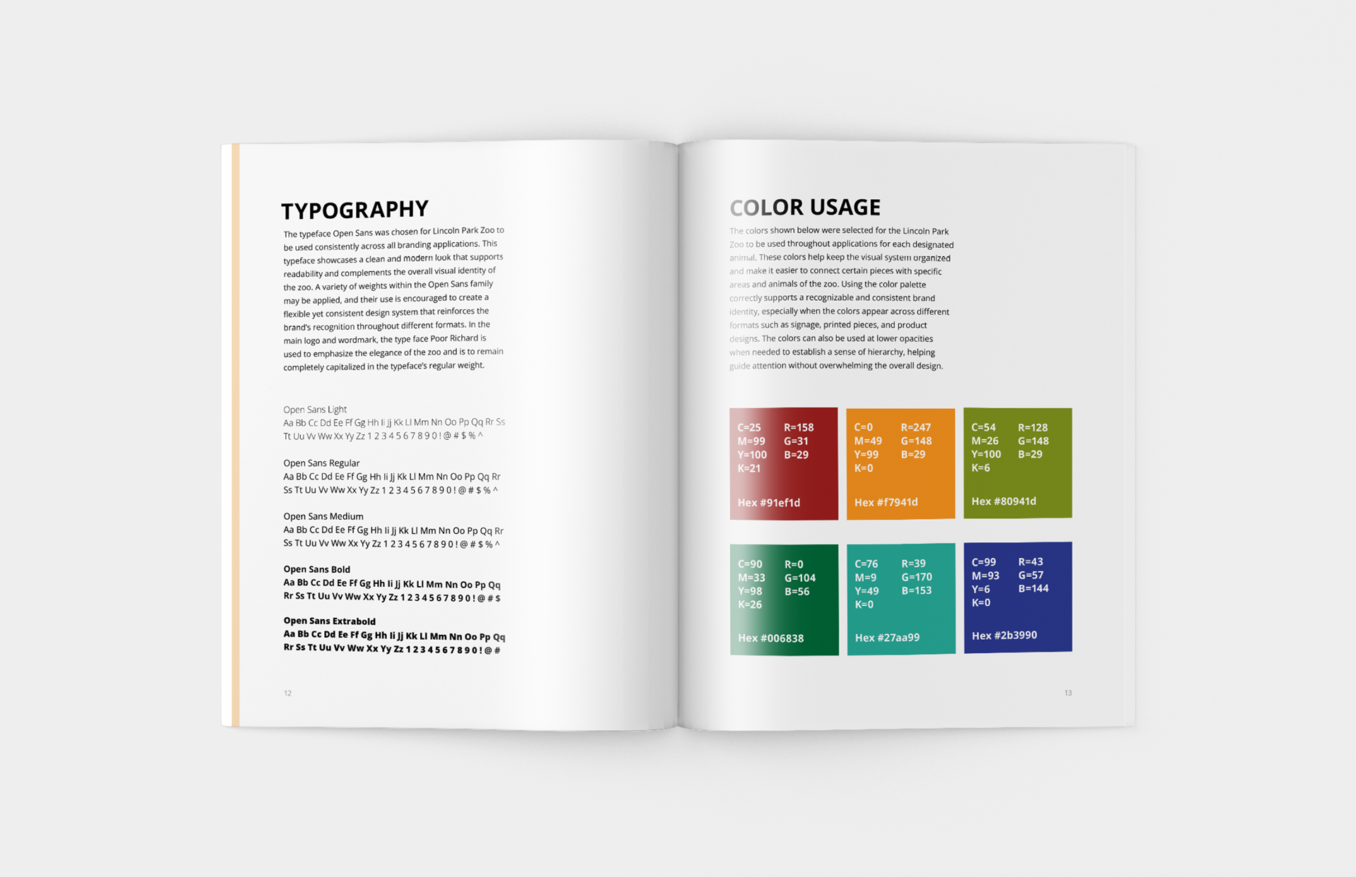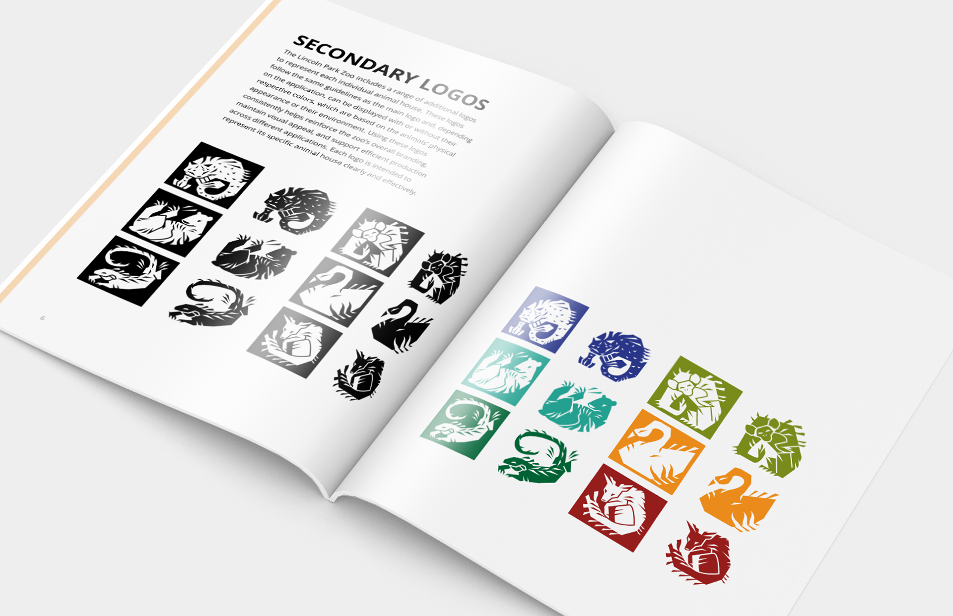 This rebranding project was created for Lincoln Park Zoo and their brand applications: signage, wearables, and vehicle wrap. I've also included the design of the Graphic Standards Manual for insight into the brand's identity. Bold, solid colors, and general shapes were used to represent each animal house while also remaining complimentary to the elegance of the rebranded primary logos. The rebranded identity of Lincoln Park Zoo is reinforced with consistent style and appealing charm.