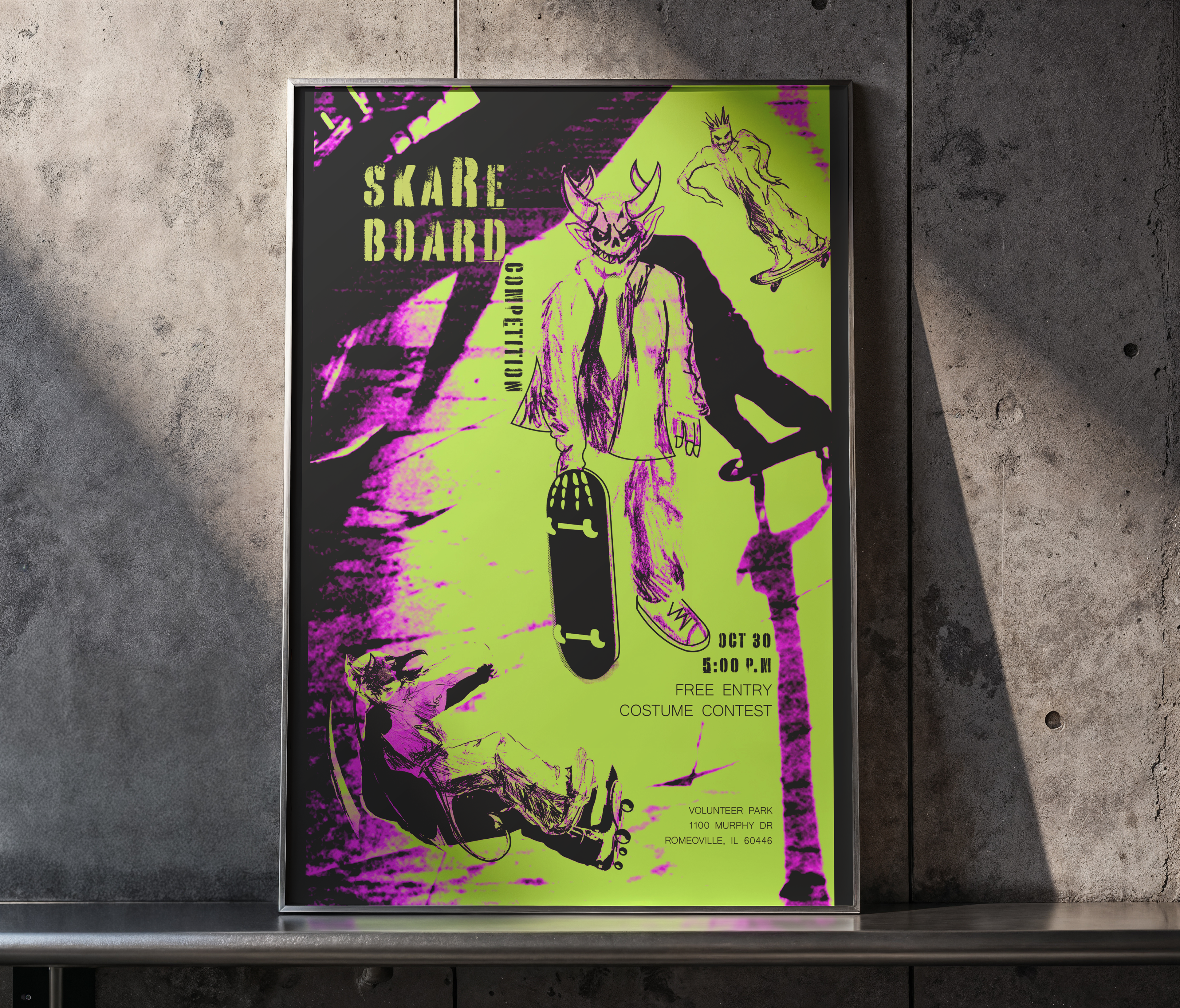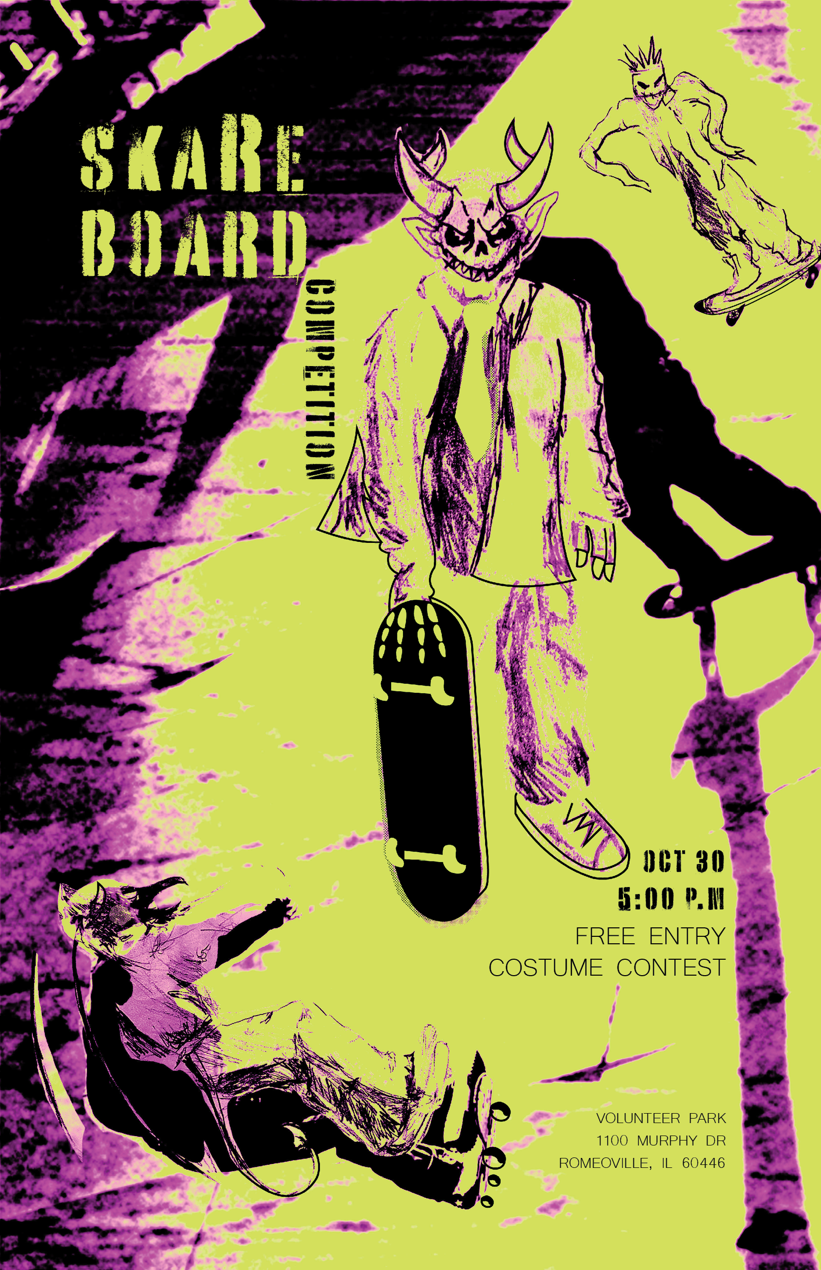 This poster promotes a Halloween-themed skateboard event. Spooky colors and illustrated characters on skateboards make it fun and energetic. One character faces the viewer directly, creating a connection and excitement. The poster is visually engaging, playful, and clearly communicates event details to teens and young adults interested in skateboarding.